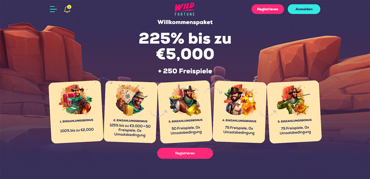 Willkommensbonus: | 225 % bis zu 5.000 € + 250 Freispiele, 0x Umsatzbedingung |